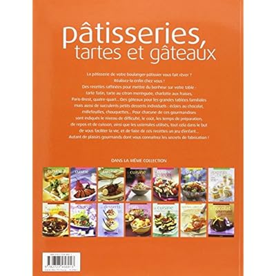 La pâtisserie de votre boulanger-pâtissier vous fait rêver ? Réalisez-la enfin chez vous ! Des recettes raffinées pour mettre du bonheur sur votre table : tarte tropézienne, tarte au citron meringuée, charlotte aux fraises, tarte Tatin, cheesecake, Saint-Honoré, Forêt noire, moka au café Des gâteaux pour les grandes tablées familiales mais aussi de succulents petits desserts individuels : éclairs au chocolat, millefeuilles, religieuses Pour chacune de ces gourmandises sont indiqués le niveau de difficulté, le coût, les temps de préparation, de repos et de cuisson, ainsi que les ustensiles utilisés, tout cela dans le but de vous faciliter la vie, et de faire de ces recettes un jeu d'enfant Autant de plaisirs gourmands dont vous connaîtrez les secrets de fabrication !