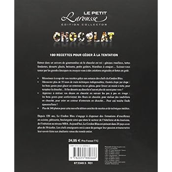 Avec la préface d’André Cointreau, président du groupe international de formation le Cordon bleu. 170 recettes à base de chocolat, toutes illustrées. Elles sont présentées en 6 chapitres pour décliner le chocolat sous toutes ses formes : gâteaux et moelleux, tartes, crèmes et mousses, desserts glacés, petits goûters, bonbons et friandises, mais aussi boissons.Une très grande variété de recettes avec :- les grands classiques connus de tous (chocolat liégeois, profiterole, macaron, éclair tout chocolat…) ;- des recettes familiales simplissimes (cake au chocolat, petits pots de crème, truffes...) ;- des créations plus surprenantes en goût (entremets au chocolat blanc et à l’orange sanguine, verrines glacées au chocolat et à la compote d’abricots, bonbons chocolatés au thé vert matcha…).Des astuces du chef en fin de recette donnent le tour de main pour réussir à coup sûr, ou encore des idées de variantes qui sont autant de sources d’inspiration pour personnaliser ses recettes.Au fil du livre, on retrouve aussi les gestes techniques de base, tous illustrés étape par étape (comment faire une pâte à chou, un glaçage au chocolat…) et à la fin, un glossaire expliquant les termes culinaires spécifiques.